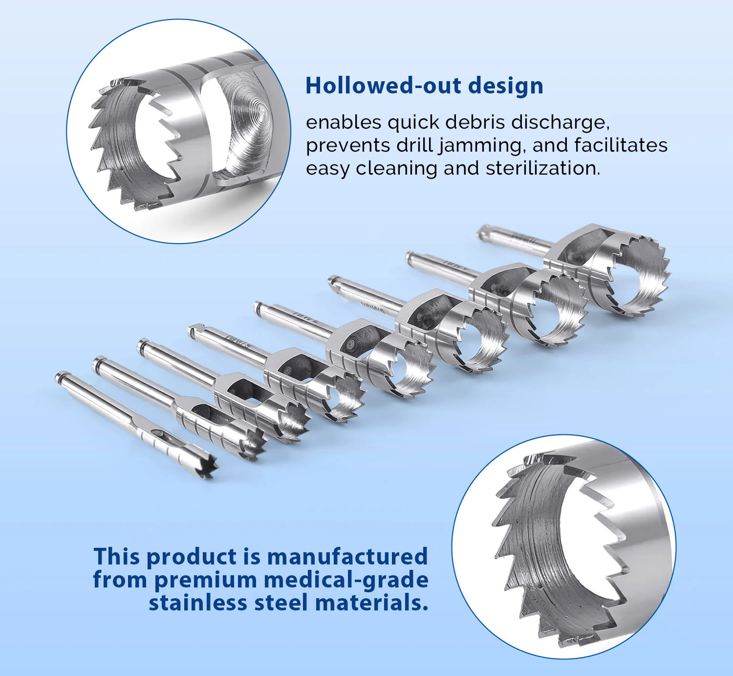 A set of stainless steel, short-length trephine drills for dental surgical procedures, including implant placement.
